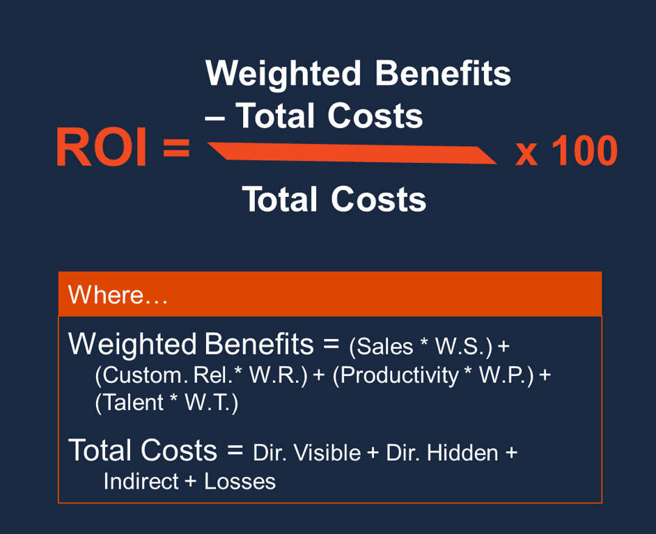 To address the unique challenges of measuring ROI in language training, a tailored formula is necessary. This formula should factor in a range of benefits—from direct impacts like productivity improvements to more indirect benefits like enhanced cultural intelligence. Additionally, it should include all associated costs, offering a balanced and comprehensive assessment of the investment's value.